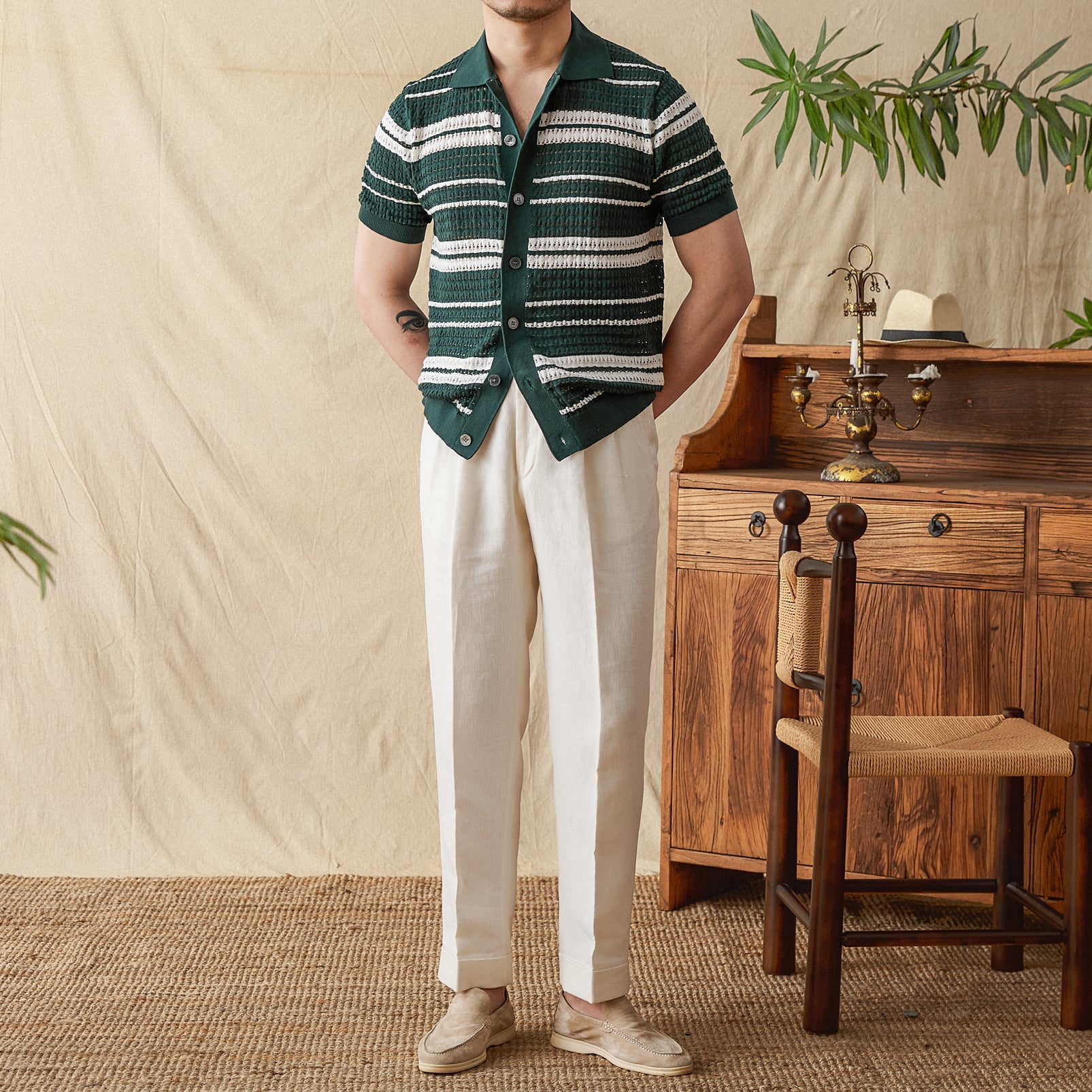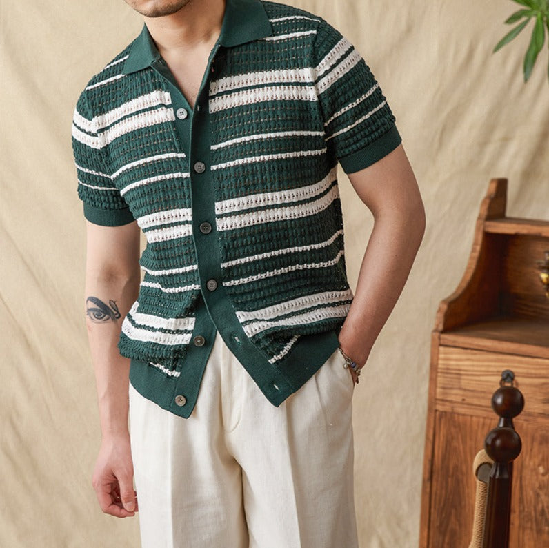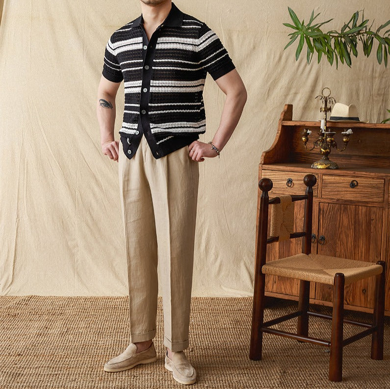 The "Beaune" shirt, inspired by the chic town in France, is a classy and unique summer essential. Made with 100% organic cotton and featuring a striped crochet and knitted design, it exudes elegance and tastefulness. Perfect for strolls in the summer, it is a must-have addition to your wardrobe.